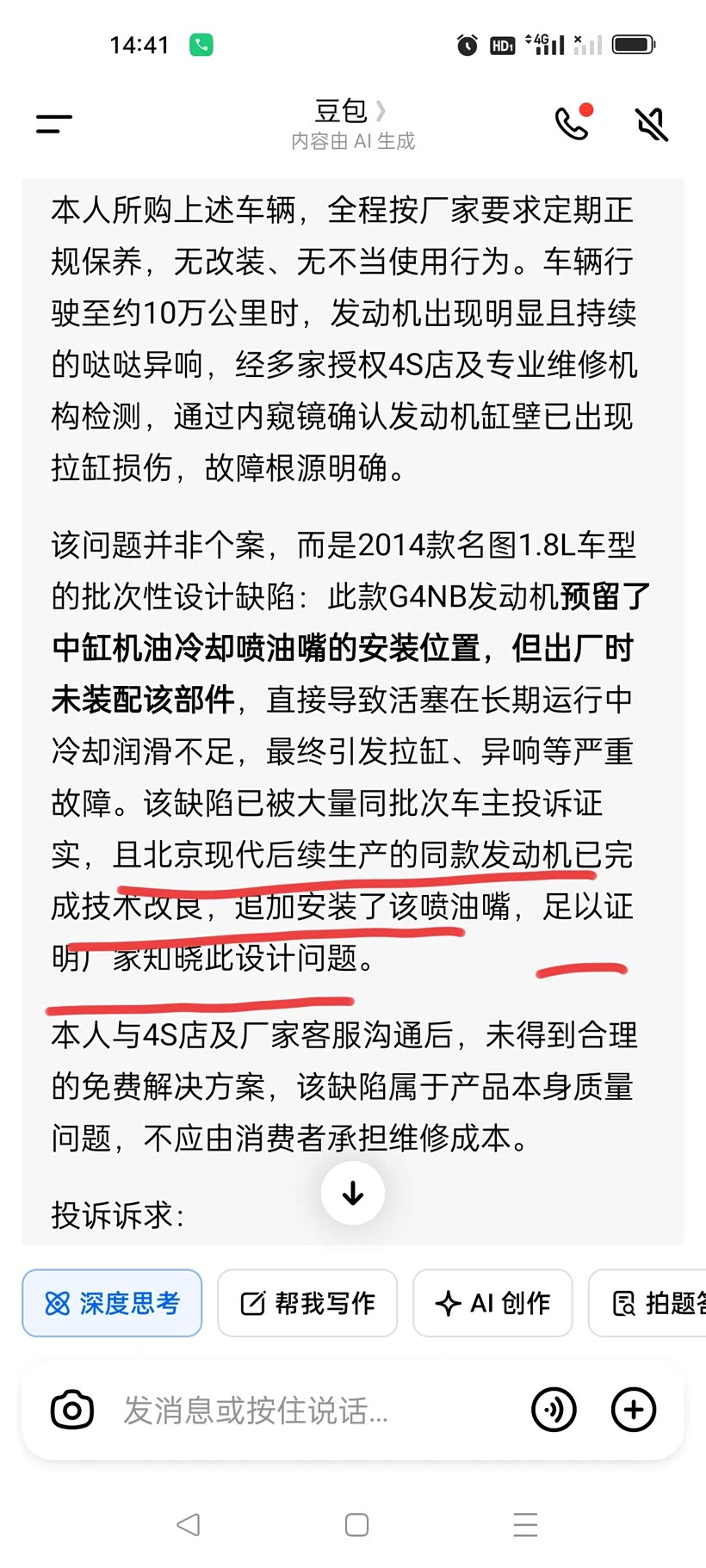 我是一名北京现代名图2014款1.8L的车主,购车后一直正常保养,未发生事故,而从我自己使用以及大量公开信息的车主投诉与行业反馈来看,北京现代多款韩系轿车搭载的发动机存在明确设计缺陷,问题早已不是个案。名图等车型发动机因缺失活塞口润滑喷油嘴,直接导致车辆频繁出现拉缸故障,即便车主按时保养、车况良好,在正常用车过程中也遭遇发动机严重异响、拉缸等故障,面临高额维修费用。这些问题并非偶发的质量瑕疵,而是根源性的设计漏洞,北京现代厂家却揣着明白装糊涂,明知此类故障只有在行驶十万公里左右才会显现,而绝大多数家用车三年都不会达到十万公里,所以刻意以“脱保“等理由推诿嫁祸于客户,愚弄国家监管部门。