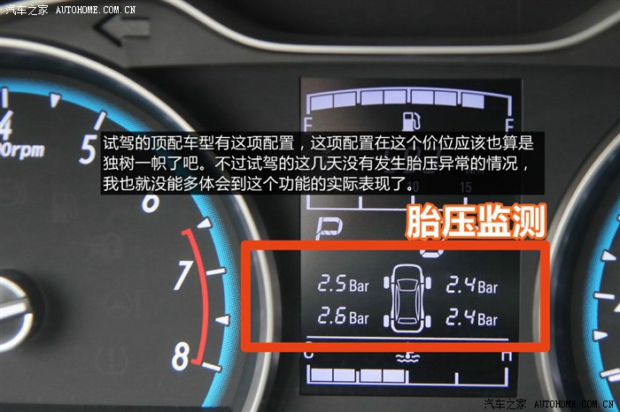 【胎压监测】试驾的顶配车型有这项配置,这项配置在这个价位应该也算是独树一帜了吧。不过试驾的这几天没有发生胎压异常的情况,我也就没能多体会到这个功能的实际表现了。倒是知道了本车在冷车胎压为2.3左右,热车之后显示在2.5左右,上海最近气温是25-30度之间。