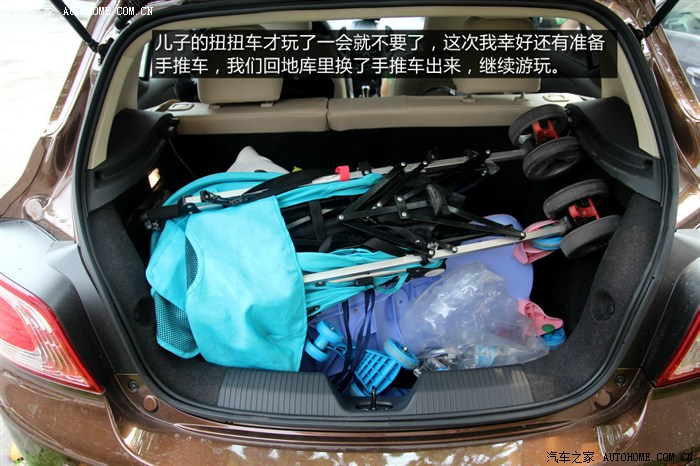 【空间感受】由于我身高才170cm,所以就不对车内空间多阐述了,大家懂的。对宝骏610来说,由于是两厢车的缘故,后排的头部空间也相当好,这点我有明显体会。同样的儿童安全座椅装在宝骏610内,再带上我爸妈一起出行的时候,我爸一上车,就在后面感叹了一句“比咱乐风后排大不少嘛,坐起来蛮舒服的”。加上后排放倒之后,可以搬运比较大的物件(我儿子的手推车+扭扭车),两厢车在空间灵活分配上还是很有优势的。