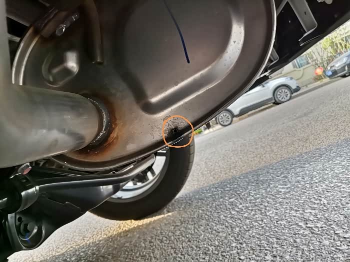 正常,汽油在经过燃烧产生C02和水,为防止水在排气管聚集造成腐蚀,故在排气管最低处打孔排水,孔为正常