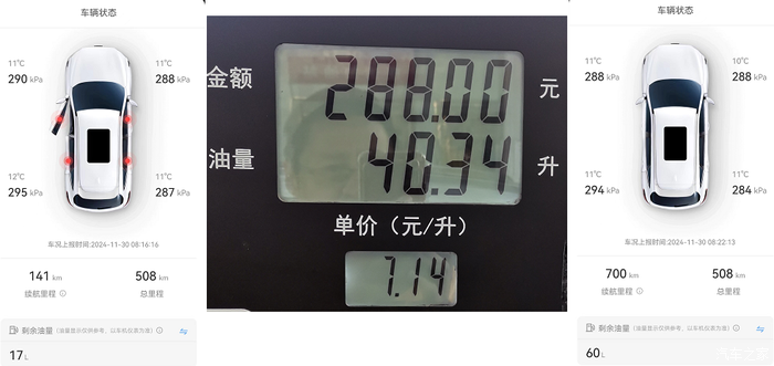 3)APP的油量显示不是特别准(加油前显示17L,加入40.34L后,显示60L),但基本够用