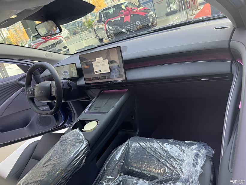 到了4S店,N6就放在显眼的C位。前脸看着挺简洁,不像传统燃油车那样有大面积格栅,最显眼的是贯穿车头的细灯带,两侧灯组小小的但挺精神,中间的日产logo还能发光,配上圆润的线条,整体看着干净又有点科技感,不杂乱。