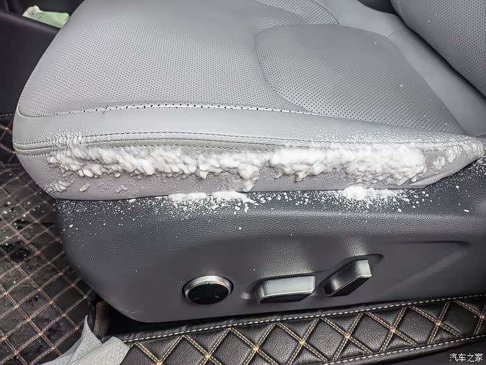 主驾驶这个位置经常上下车,容易摩擦到它,也特别容易脏,我这里给车友们分享一下,再喷上泡沫清洗剂之后,我们可以用湿巾纸来清洁这个部位,湿巾纸比毛巾洗的更干净,车友们可以试一试。