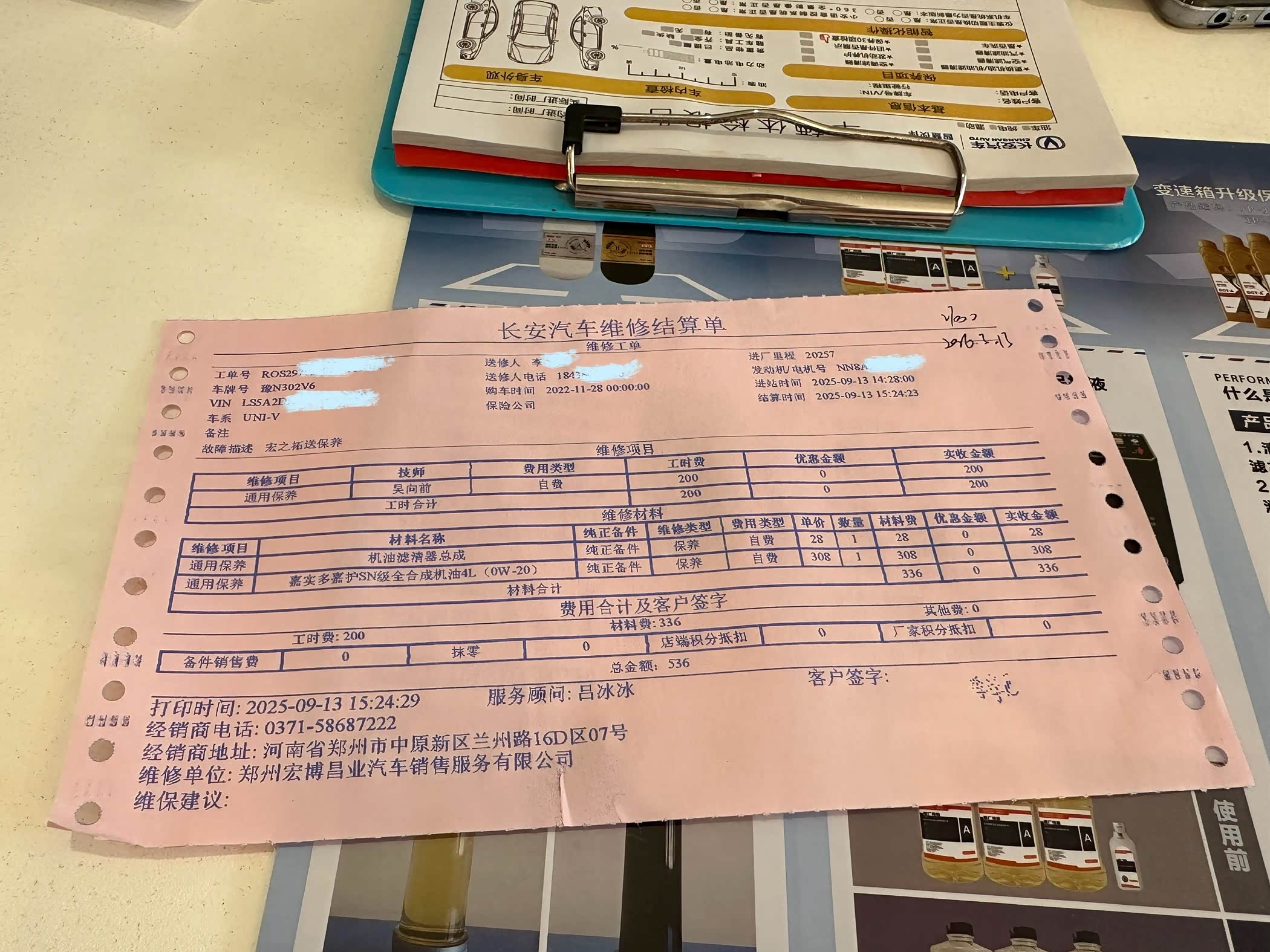我这台UNI-V的保养政策挺厚道,买车时送了几次基础保养,所以这三年的小保养,我几乎没花钱。而且长安的售后服务点比较多,流程规范,提前预约基本不用等,还是蛮省心的。