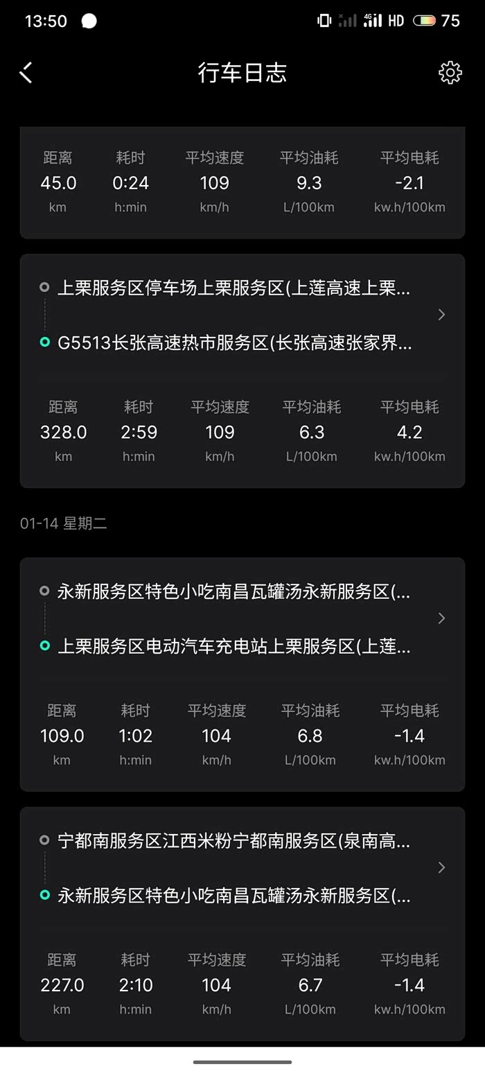 能耗表现:日常上下班通勤用纯电,晚上家充充电,3毛1一度(峰谷电价),6块钱充满,上下班来回40km,极限情况能跑3天(一般2天一充),还是非常省的。长途高速用超级混动,打开地图,系统自动匹配动力模式,暑假一家人东戴河自驾游,来回1530km,看行车日志,每一段路程的油耗均有波动,油耗大致在4-6之间,但手动实际计算下来在5.5L/100km左右,车比较大,这个油耗也可以接受,当然这个数据是我手动计算的,可能会略有偏差,仅供大家参考。