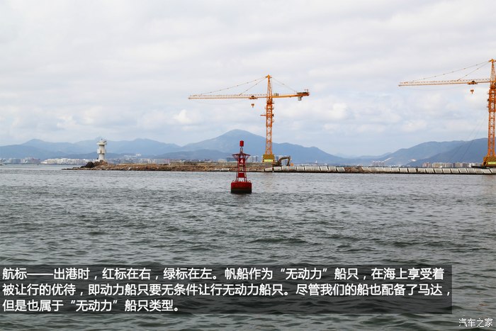 航标,出港时,红标在右,绿标在左。帆船作为“无动力”船只,在海上享受着被让行的优待,即动力船只要无条件让行无动力船只。尽管我们的船也配备了马达,但是也属于“无动力”船只类型。