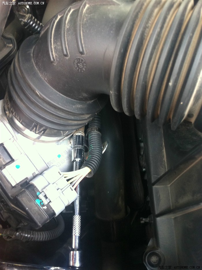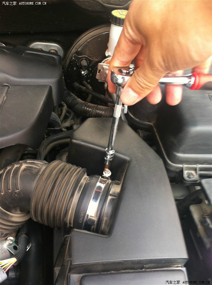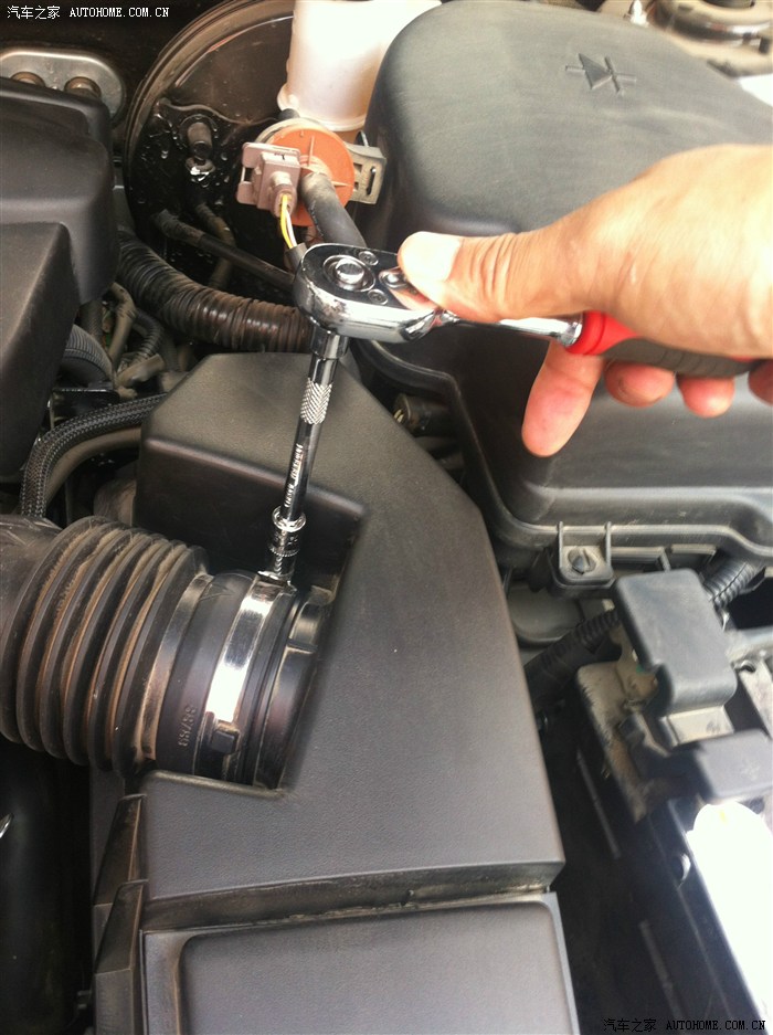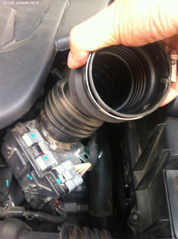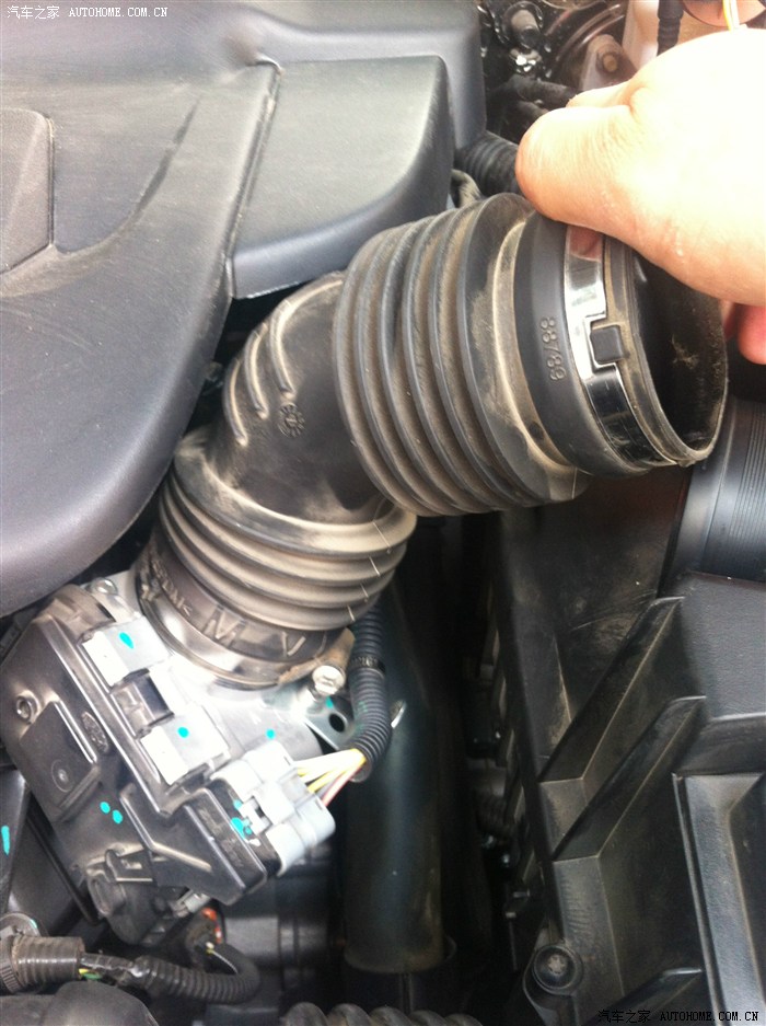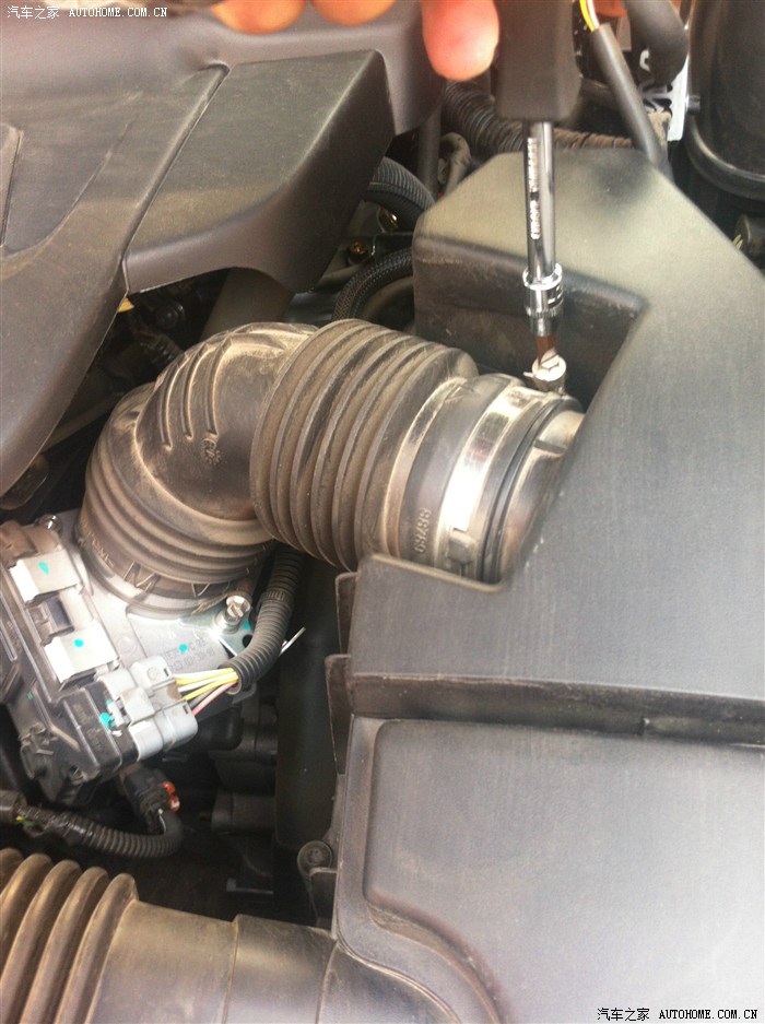 松完后就可以把这根大肠上部分离出来,然后松下面和节气门连接的套环上的螺丝至套环松动,就可以把这根管子去掉了。