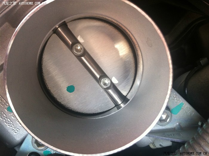 终于看到蝴蝶阀了,出乎意料的是蝴蝶阀并不像其他品牌车辆那样,特别是带涡轮增压的车型的蝴蝶阀特别脏而且有很多油泥,而是在蝴蝶阀两边周边有点黑色的积炭或者说是空气中带有静电粘连在一起的尘埃,并没有发现有油泥或机油,表现非常理想。