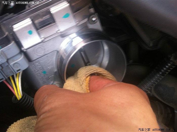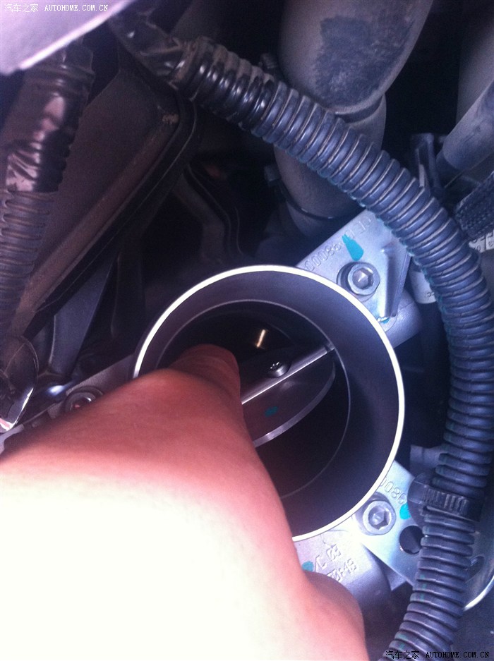 要说明的是车钥匙拔下,研究完蝴蝶阀设计原理后,其实不用另一个人踩住油门踏板,只需要用手指伸进去蒋蝴蝶阀低的一边向下小心轻轻按压就可以手动打开,这样就可以简单对蝴蝶阀正反面和边缘进行清洗(有些4S的师傅为了省事也是这么干的,而且是把化油器清洗剂直接往里面喷。保守的讲最好把华油清洗剂喷在抹布上,然后将抹布包在两根手指上伸进去小心、多次、正、反面擦拭,最后再用干抹布擦拭,这样不会出现部分化油器清洗剂液体进入进气道或流到氧传感器上。