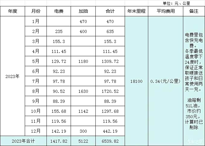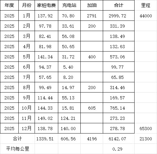好了,最后再来算算全年的费用吧,全年跑下来,在家桩充电花了1339.51元,在市里的充电站总共是花费了606.56元,加油是加了4196元,总共花费6142.07元,里程呢从4.4万公里跑到了6.53万公里,一年跑了2.13万公里,这样算下来呢全年平均每公里费用是0.29元,比起我23年的平均费用居然有所下降,主要是平时用电开车不急加速,这样能耗也能降下来。
