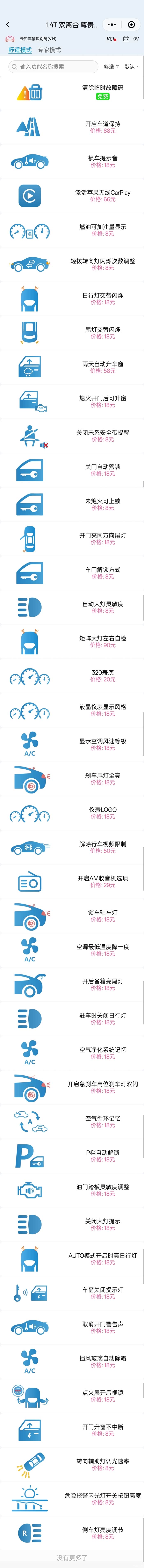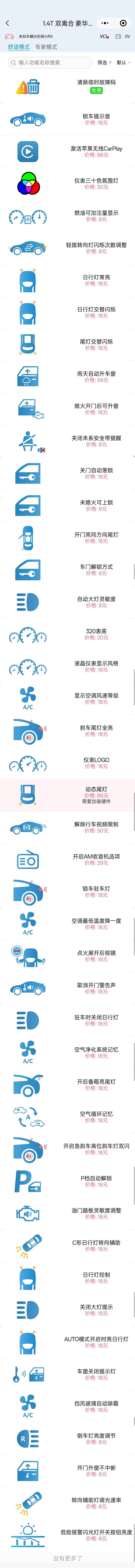 不同型号及配置的汽车可以刷的功能不一样,例如豪华就不能刷车道保持,选择自已汽车型号后就可以看到所有可刷功能,我把22款尊贵和豪华的功能都截图了。各位车友可以看看,参考一下。