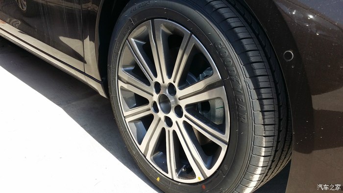 轮胎品牌为固特异,型号是安舒轮,尺寸为215/55R17,胎毛明显,应该是新的轮胎