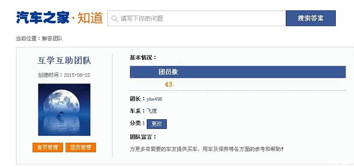 2015年8月我又申请组建了汽车之家知道解答团队------互学互助团队,感谢团队对我的信任和支持,虽然现在团队队伍不是很大,但是我相信经过我们汽车之家互学互助团队全体团员的共同努力 ,我们的互学互助团队一定更加壮大的!欢迎你加入我们团队http://zhidao.autohome.com.cn/steam/ulist?teamid=1794,我们的宗旨--为更多有需要的车友提供买车、用车及保养等各方面的参考和帮助!
