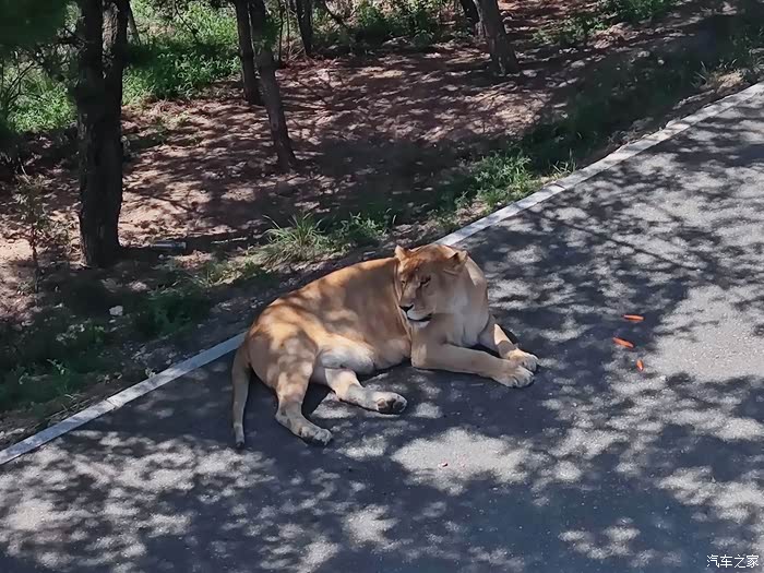 看完老虎往前走没多远,就看到了威风凛凛的狮子。一只金毛狮子正趴在路上,它那威严的眼神扫视着周围,仿佛在宣示着自己的领地主权。