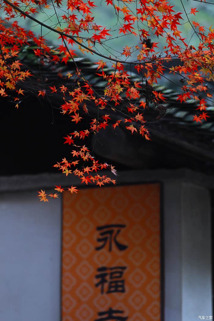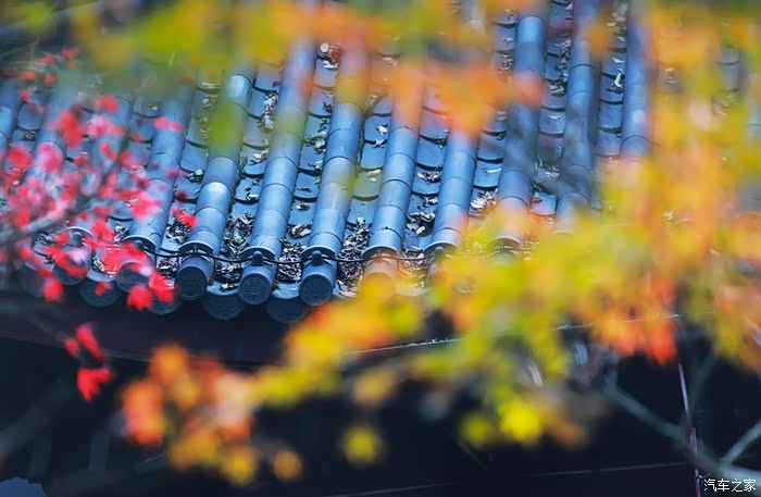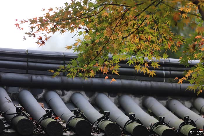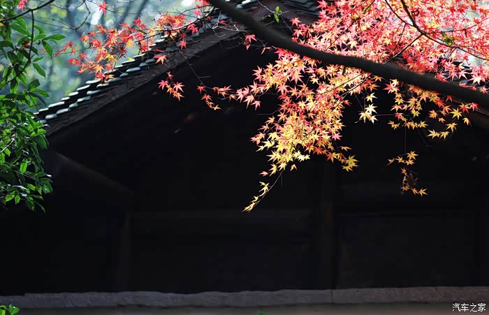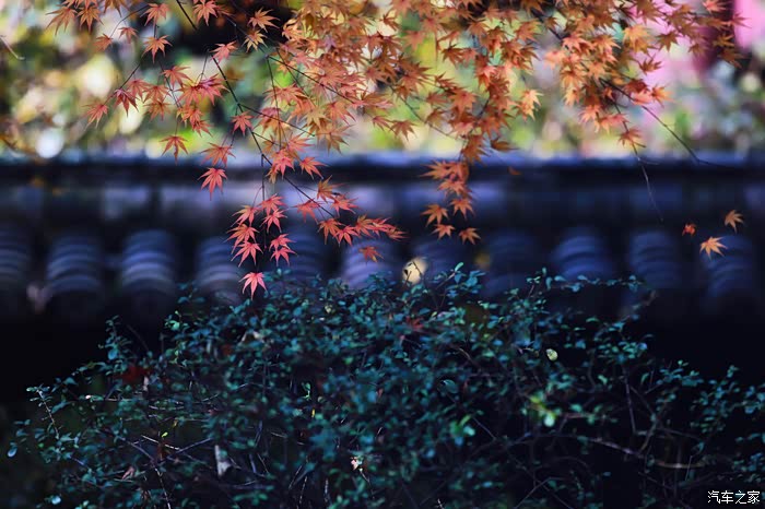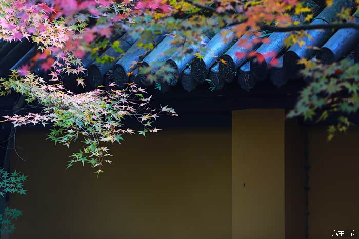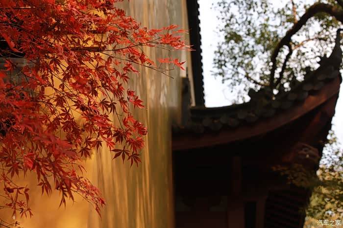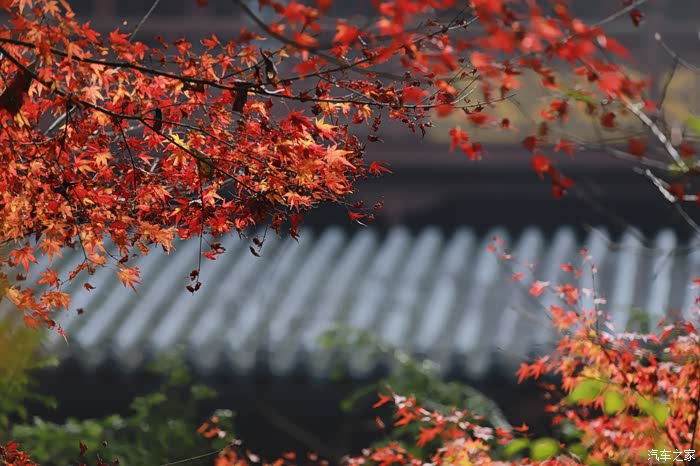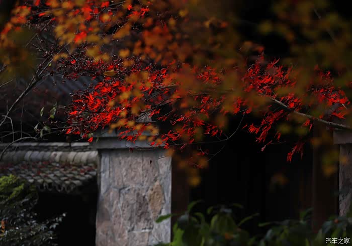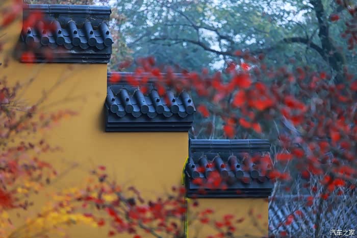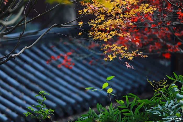 黄墙黛瓦与红叶相得益彰