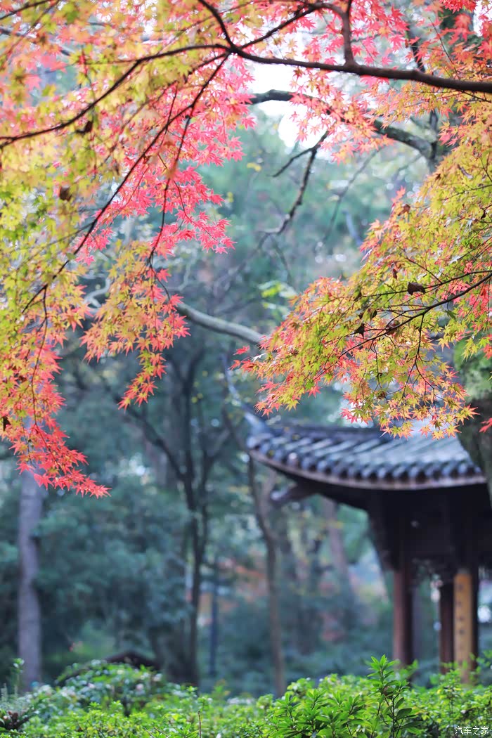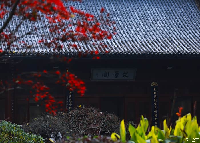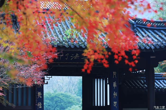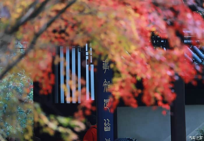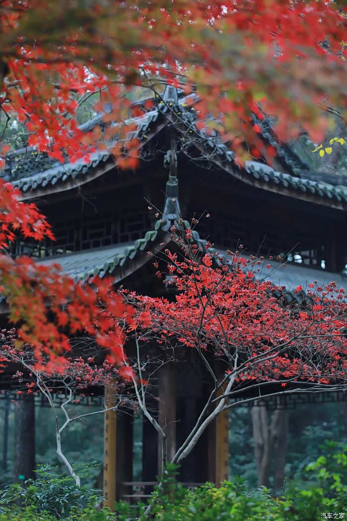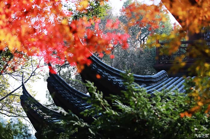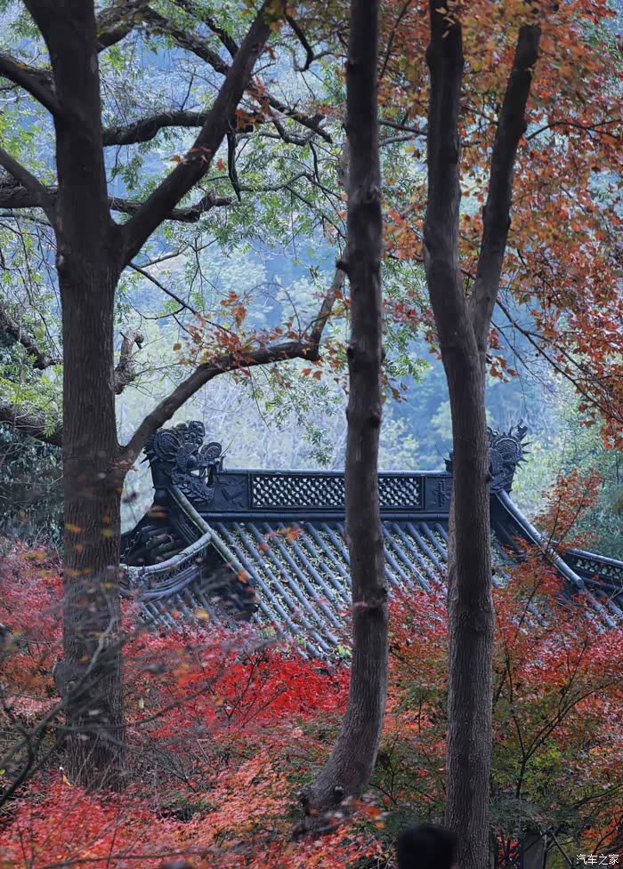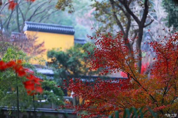 黄墙黛瓦与红叶相得益彰