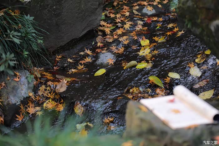 枫叶洒落溪水,顺流而下