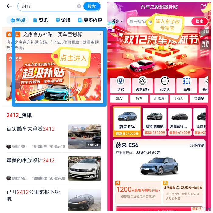 方法2:打开汽车之家App,搜索 2412,点击超级补贴活动进入,输入想要购买的车型点击领取;