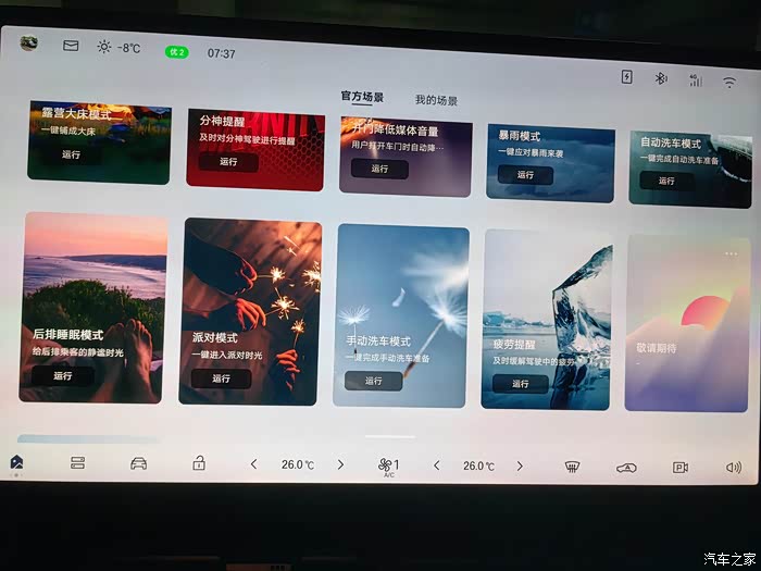 然后就会出现上图这个页面,出现了很多场景模式,什么后排睡眠模式,什么疲劳驾驶提醒模式,什么自动洗车模式,手动洗车模式…洗车的时候点击运行即可。