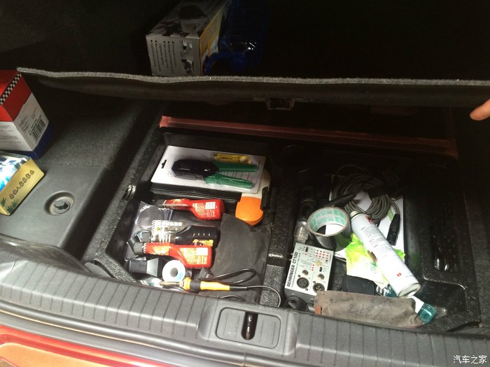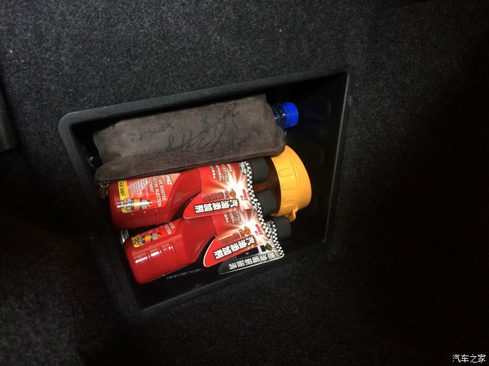 后备箱的有个小格。 可以放这些东西 。 装笔这包是张学友签名的哦。 还是搞了几瓶添加剂, 感觉没有什么用 ,SSSS的人说不要加, 要加也加他们的 。晕 。