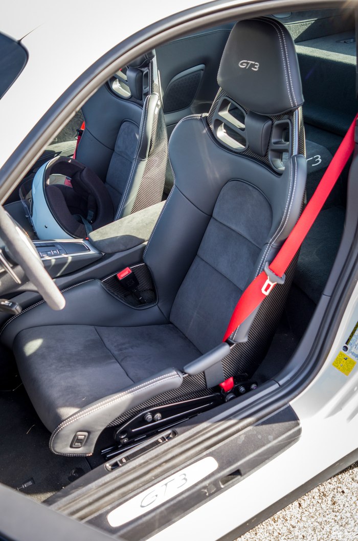 座椅预留了安装五点式安全带的位置,但是下面缝线是缝上的,需要自己拆开。如果想要安装五点式安全带,还需要加装防滚架。防滚架在欧洲是一个选配,但是在美国。。。因为“安全”原因禁止原厂车出厂带防滚架,所以就没有了。但是奇怪的是如果是GT3 RS原厂就有防滚架。另外之前论坛有人问为什么欧洲出厂的防滚架不是全包式的。这里说一下,全世界大部分的国家,全包式防滚架是被静止上路的,为什么呢?因为如果你被其他车撞了或者你撞上其他车,在你没带头盔的情况下,防滚架如果发生位移的话很有可能会要了你的性命。当然要撞到防滚架都位移也是挺牛的。。。