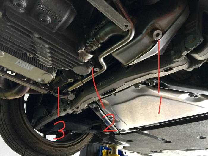 放油的顺序是1,2,3。因为找不到适合的中文翻译,我就用英文了。1号是oil tank的螺丝,2号是oil pan的螺丝,3号是机滤。值得一提的是oil pan有两颗螺丝,可以选择放一颗或放两颗,放两颗放得更干净一点,没差多少。另一个螺丝位置看下图。oil tank和oil pan的螺丝都是用标号为8的六角形螺丝刀。