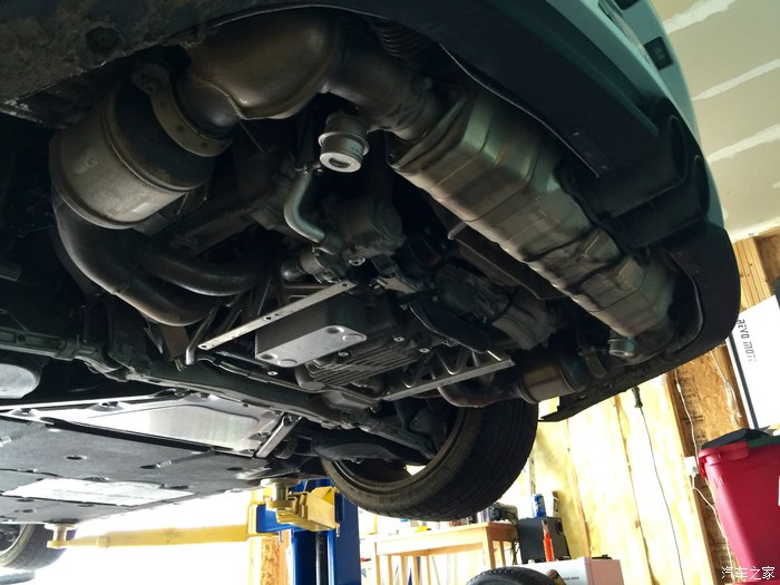 正在放oil tank的油。oil tank里油压巨大,刚松螺丝的时候小心喷涌而出的热机油。可以看到边上的排气管路上都溅到了油。有一个方法就是松螺丝之前不要把上面的机油口打开,这样油出来会慢一点。