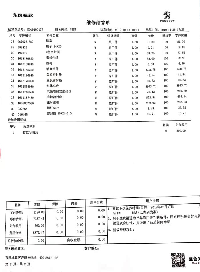 写在最后,我的车16年4月买的,1.2T三缸机,开了将近5年了,8W公里。19年4月份发现烧机油,未换过皮带。去4S检查,测试了千公里消耗200g,不达标准,说是正常消耗。到了9月份,烧的非常严重了,3000公里机油到底,由于刚刚出保,然后车质网投诉,没几天4S主动联系我去做机油测试,当时里程5.9W。到了10月初,测试结果出来了,千公里消耗500g,然后车就扔在4S了。中间和4S还有厂家一直在交涉,最终得出方案,进行发动机拆解检查,如果是车质量问题,维修费用由厂家承担,如果是人为保养或者加入劣质汽油导致的,让我自行承担。我同意了。大概10月14号左右,4S人员联系我了,说发动机拆解了,厂家同意免费维修了。由于距离4S有60公里,期间就去过一次,看了一下没发动机的车,4S说主要在等厂家配件,由于缸体磨损,需要更换。到11月26号,4S联系我去取车。一共用了50天。后来加了vx群,大部分是1.2T发动机车主,里面将近500人,具体多少人烧机油不清楚,反正群里每次讨论的话题都离不开烧机油,大修,索赔发动机等关键词,有想进群的私聊加我,我拉你们进去。