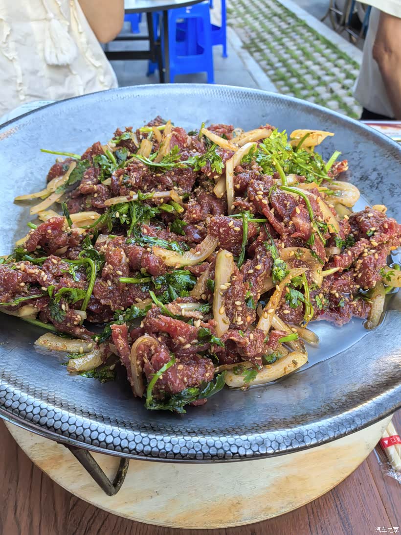 晚上必须尝尝当地的特色美食,找了一家口碑不错的朝鲜族餐馆,点了招牌的特色烤盘 —— 满满一大盘牛肉,搭配着洋葱、青椒等配菜,经过炭火烤制后香气四溢,入口鲜嫩多汁,这样一份足量的烤盘竟然只要70元,性价比高到让人惊喜。除此之外,米肠、冷面和酱汤也不容错过:米肠软糯入味,带着淡淡的米香;冷面酸甜爽口,汤汁冰凉解腻;酱汤浓郁醇厚,喝上一口暖意十足,一顿饭吃得满足又惬意。
