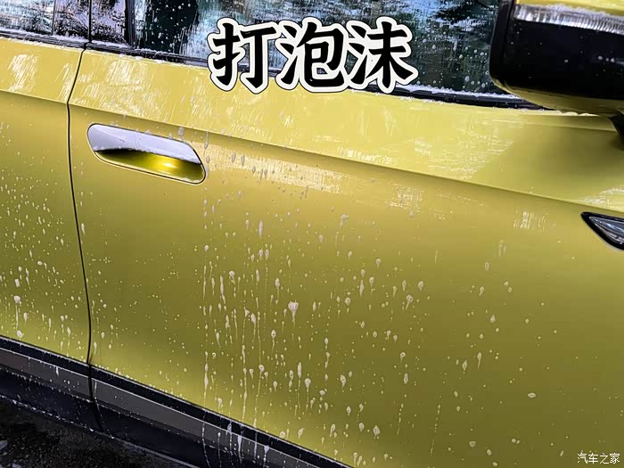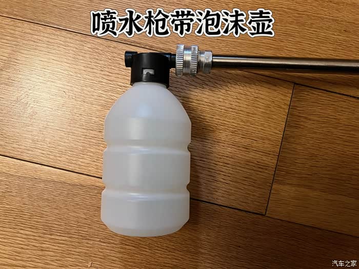 第二步是喷洒洗车液,在泡沫壶罐中灌入洗车水蜡,用洗车枪将洗车泡沫液均匀的泼洒在车身之上,这一步的难点是将泡沫均匀的喷洒在车身上。我也是试了好多次,包括寻找到合适的汽车泡沫水蜡的配比,洗车枪喷洒的力道和角度等,才初步能把泡沫打匀了喷洒在汽车的全身。