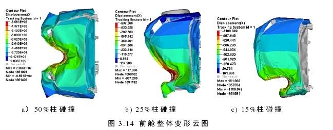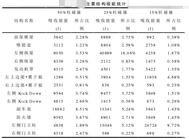 25%碰撞中主要吸能结构为左侧纵梁、左侧Kick Down、副车架、前保横梁、左侧立柱和防火墙