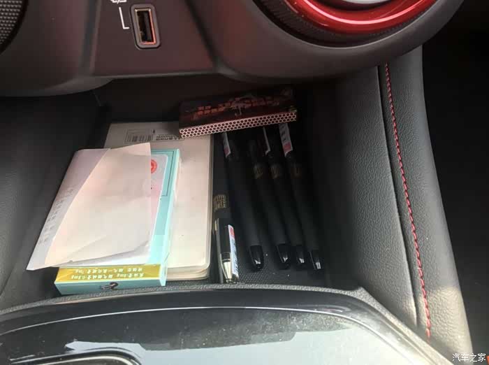 坐在驾驶室里,各种储物格方便收纳,车门上设计了一个专门用来放雨伞的储物槽,对我来说平时放矿泉水特别合适,放折叠伞也是可以的。中央扶手箱下面深度相当于一瓶水的高度,里面配有2个充电口和一个220V的电源接口,并且扣上扶手两边留有凹槽,充电设备线可以顺着凹槽走出来。空调口下面还有凹槽储物格,放账本、笔、手机没问题,还有水杯架的设计,副驾驶中央扶手侧面还有个放本子的地方。储物空间无可挑剔。