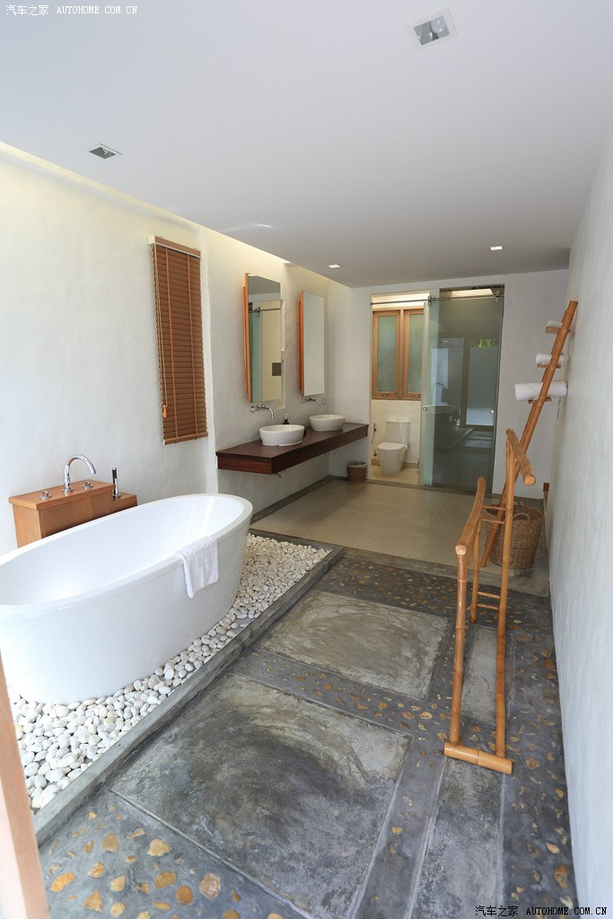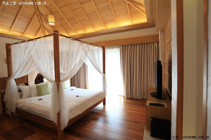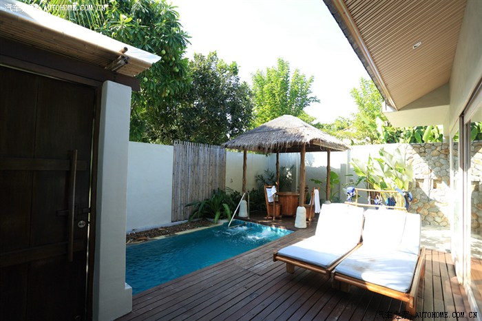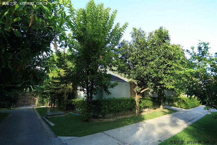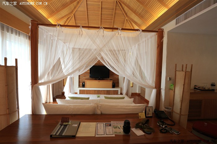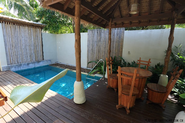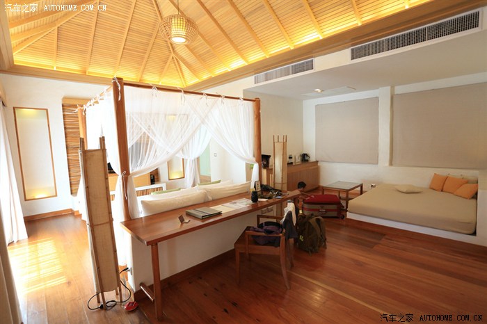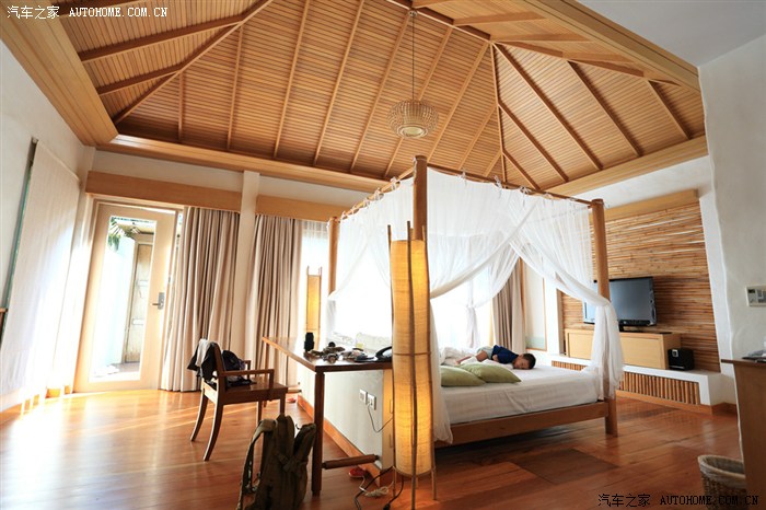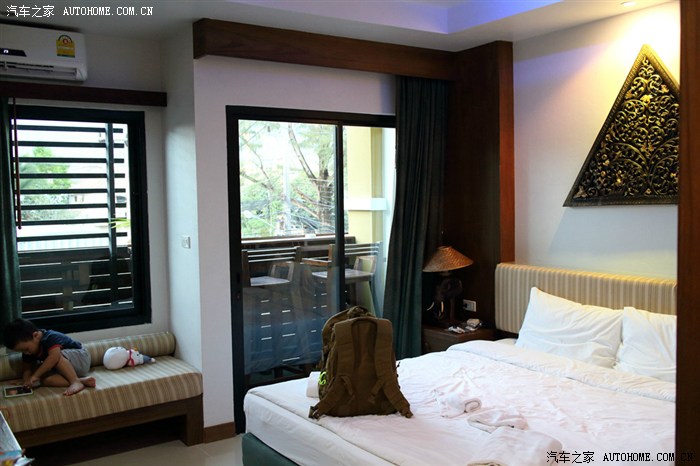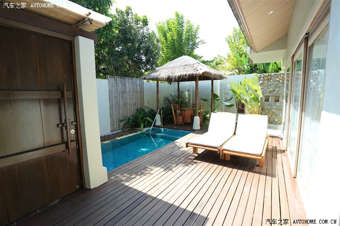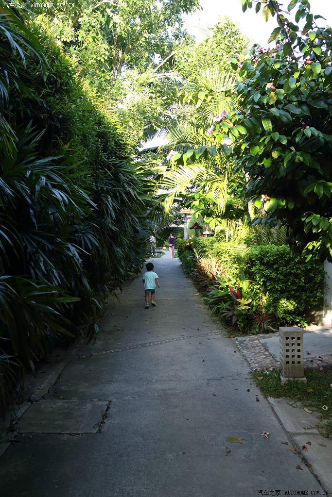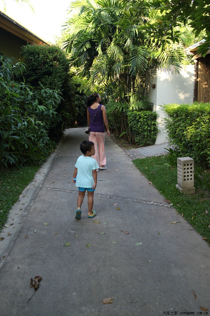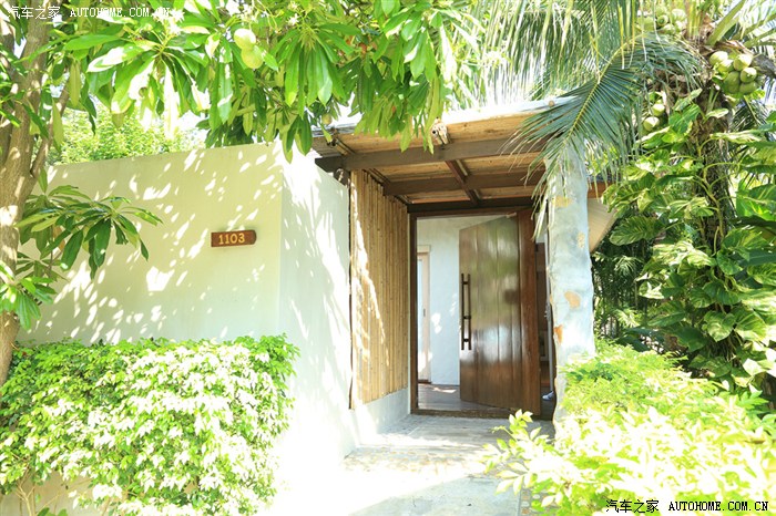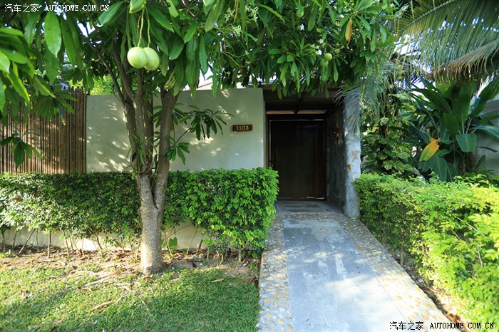 因为没有到时间,叫我们等了一会,就开始不断上果汁糖果招呼我们了。儿子毫不客气灌下两杯果汁,看着孩子这么吃东西,这个旅程我一直笑和汗的状态。等了没多久,就安排房间给我们了,我还以为要等到下午三点呢,因为booking网上这么介绍的。提着行李,上了电瓶车,绕进园林式的酒店,就到了我们的房间了。大气的木门口背后,就是我们想要的房子,上图