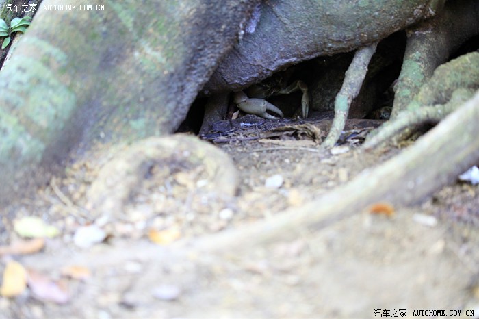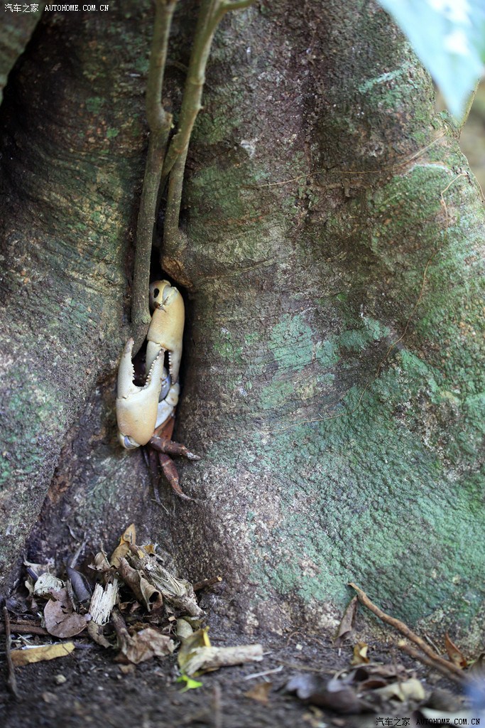 到了下午2:30集中,我们去找找鸡鸣蟹吧,它的家住树洞里。我们到林子里去,要找鞋穿上不然会扎脚?不好意思,没有!鞋子都在岸上(自备放包里的除外)!3岁的儿子也跟我们光脚走进林子里,多原始的旅程。但是一路走来都不是很辛苦,没有扎脚的树枝,没有虫子爬上脚,什么都是细细的,踩上去很舒服。我们跟着导游,我们找到两只在树洞里的鸡鸣蟹,好大一个钳子啊,估计它能剪掉我的脚趾,不过还好它不动,我们一路静悄悄地走着,导游说现在不是季节,2月份会更多。