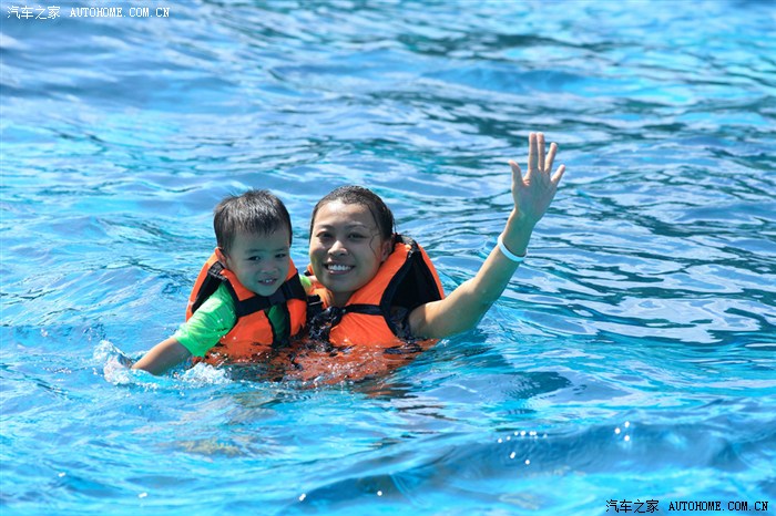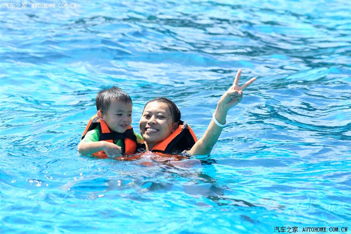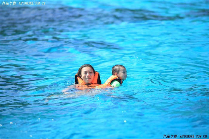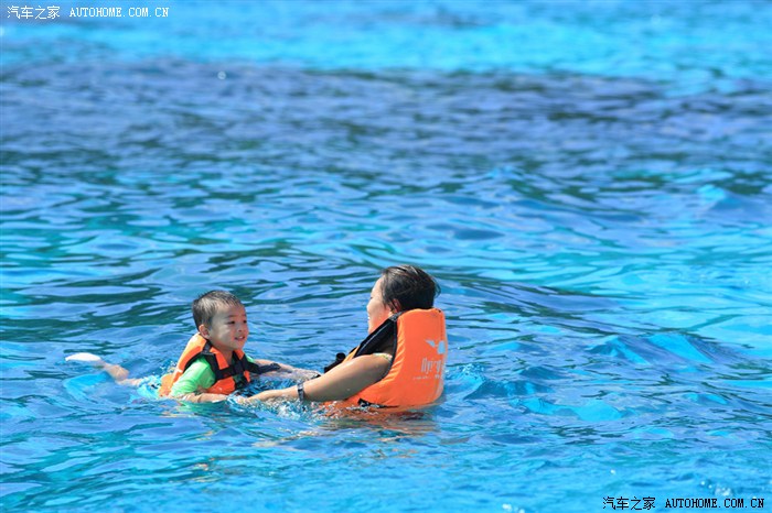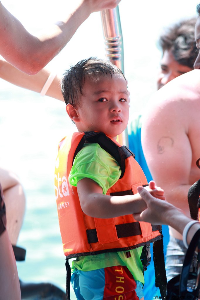 我在船上拍照,听到老婆说,看到很多小鱼游来游去。就潜了一次,儿子就在船上喊要下来游泳了,哈哈!水深大概约3米左右,老婆就拉着儿子在游泳,他玩得可高兴呢!约半小时,我们上船又去到另外的潜水点,上船后导游招呼我们吃些水果,估计想到我们潜水玩得累也饿了。老婆又再次穿着救生衣浮着开始潜水了。这里的鱼很多,很大很漂亮,小鱼游到你什么跟你只有5到10厘米,你就是抓不到它!