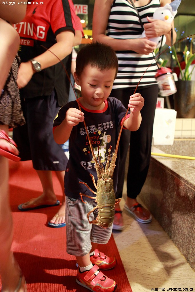 那位会广州话的阿姨,她很热情的抓了一只龙虾给儿子拍照