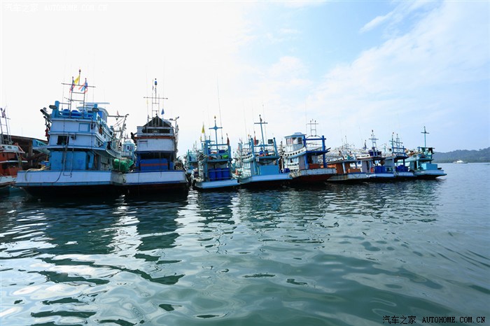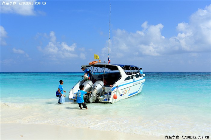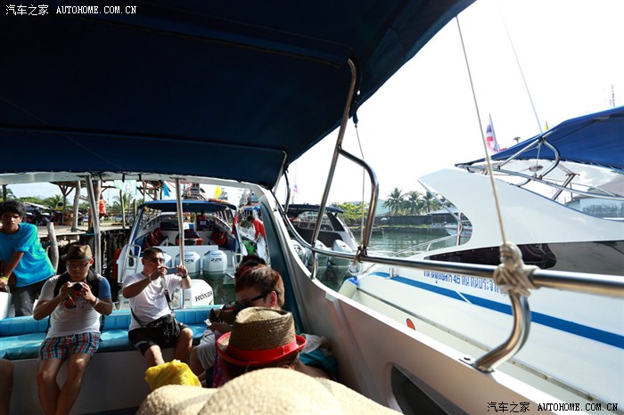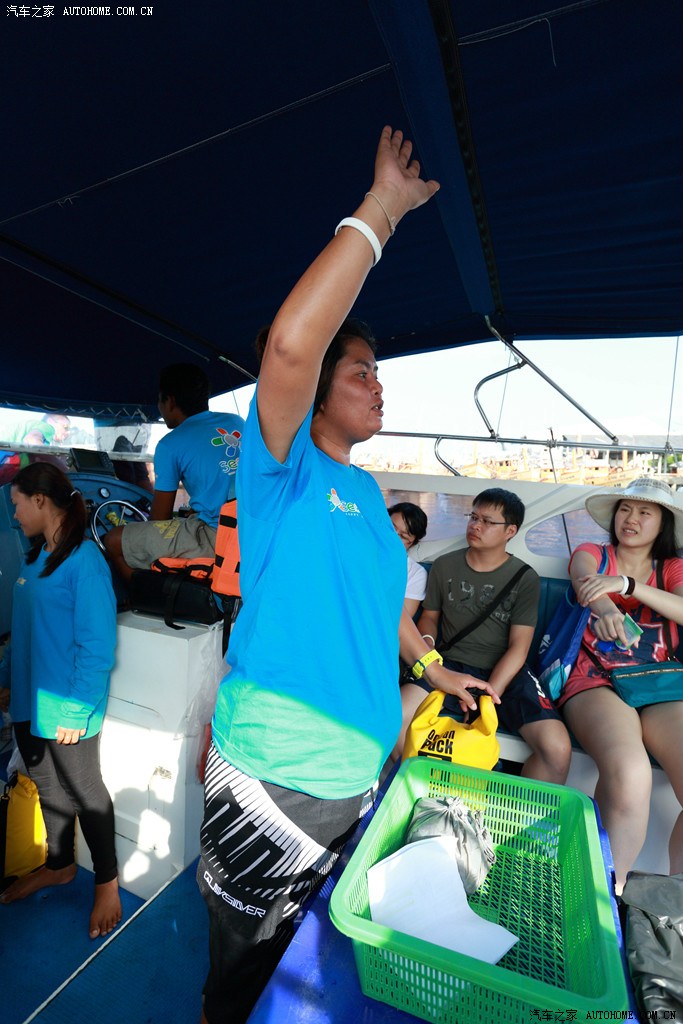 早上6:15在酒店等候出发,可怜的儿子被我从梦中拉出来了。一辆12座的面包车到每个酒店拉上预约好的客人,大概8点多才真正出发上路。历经差不多两小时的车程到达了码头,按照名字登记后领到每人一条手带作为记号用,因为游客太多而且有好几条线路都是在这出发的,无法记着每个团友是否自己线路的,所以没人派发一条手带以便记认,我们这条线路是白色手带;然后就可以去吃自助早餐,有面包蛋糕果汁奶茶咖啡等任你享用,当我吃着面包,泰国导游就喊:“白色......白色”哈哈,好可爱的口音。匆匆把面包往嘴里塞,屁颠屁颠地跟上去。边走边有船员照相,我以为是给你照相要钱的。后来才知道原来那是照相认人的,以防走失或者方便记认,我顿时觉得自己很惭愧并很佩服泰国旅游发展的成熟,怎么国内旅游团给我一个这样的印象呢?上船之前要脱鞋子,带孩子的优先上船,每人发一件救生衣穿上,就开始1个半小时的船程。痛苦啊!!!!!坐船上的感觉就是抛起之后狠狠落下,落下的声音就是“嘭”响。“嘭嘭嘭....”嘭一个半小时屁股都痛了。从此我孩子听到说要坐船就说不要坐嘭嘭嘭的船,哈哈!
