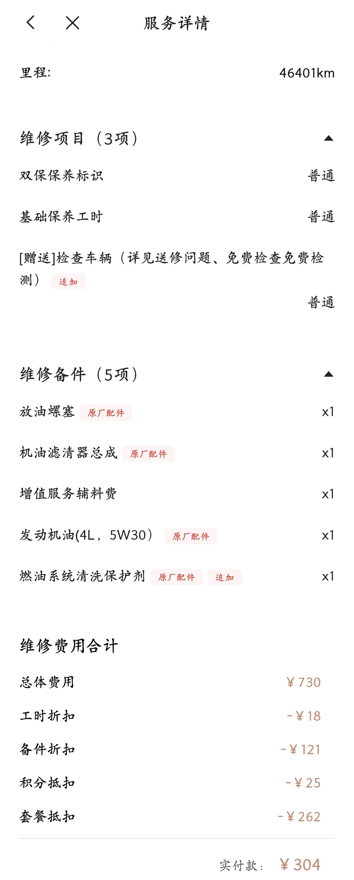 二、 保养成本:老车养护不贵,全年2次保养花860元