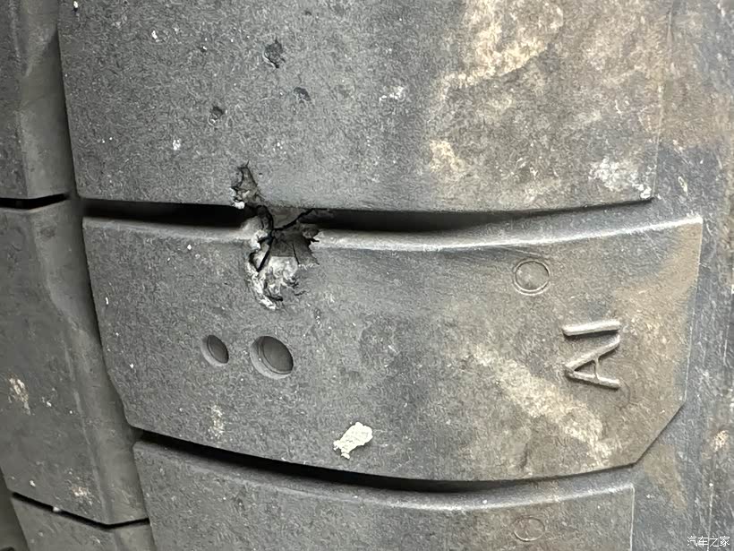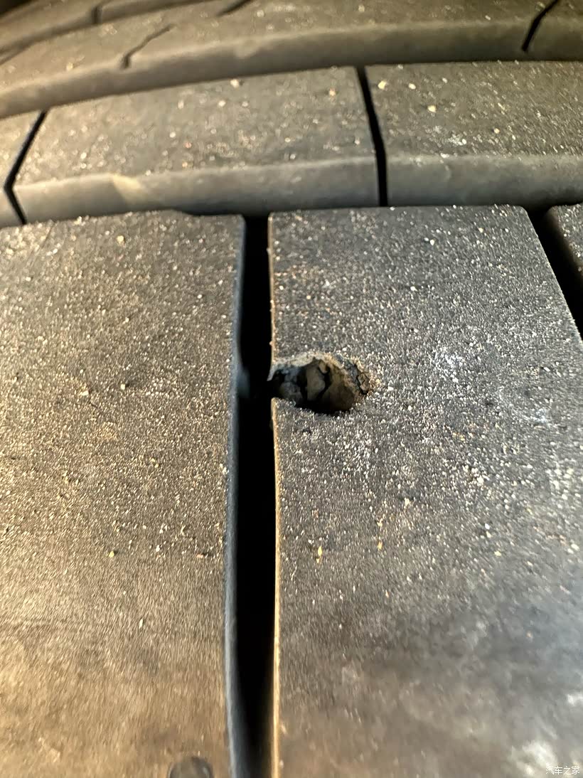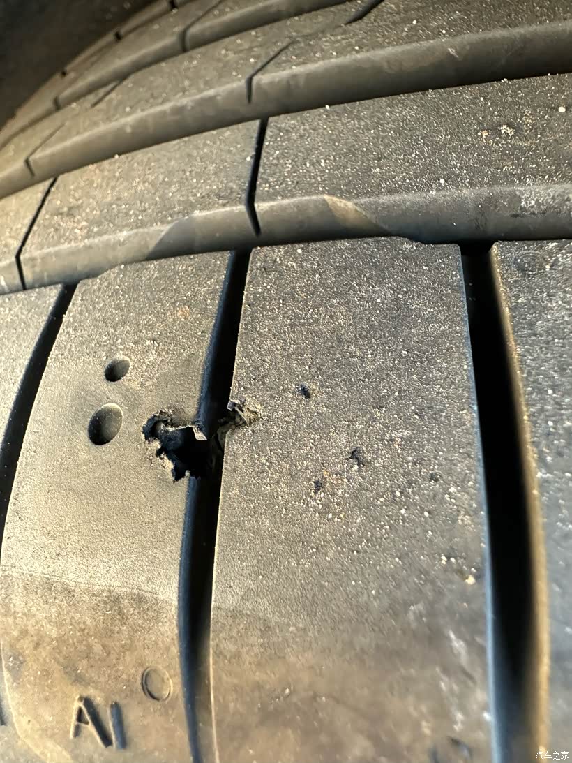 这看着像是扎到了什么尖锐的东西吧?你可以去轮胎店检查一下啥情况,严重就换,不严重就继续跑。