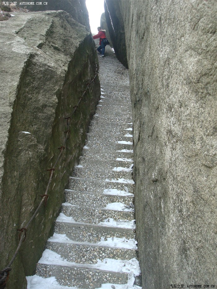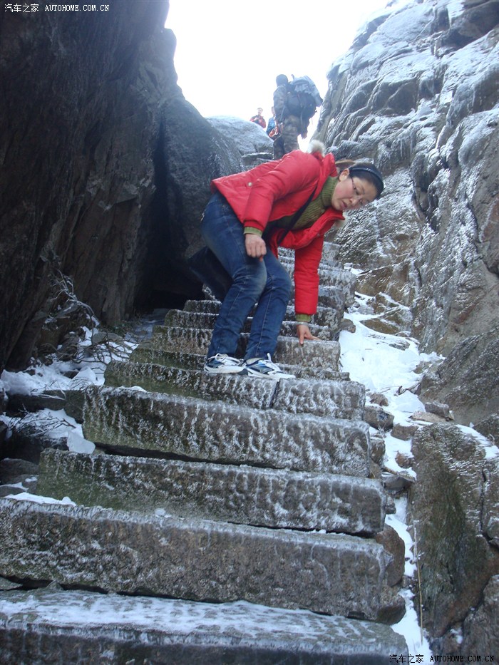 前两天这里下了一场雪,上山面(奇谷天梯)处于山峰的南面,而下山面处于山峰北面,南面雪已化,北面雪尚未化尽,部分台阶产生冰冻,怎一个“滑”字了得。