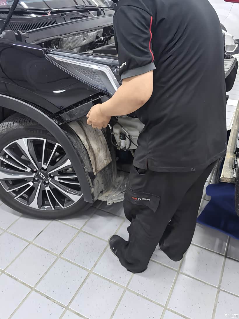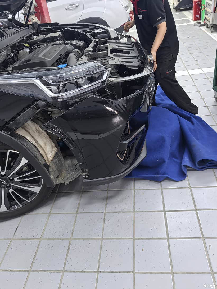固定螺丝拆完,师傅在车前地上放置地毯,以防刮伤中网漆面,这个小细节非常不错。