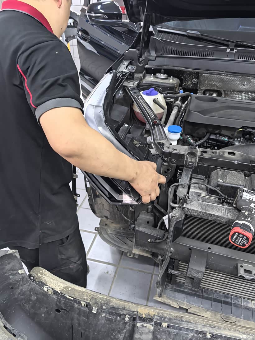 新大灯安装完毕,师傅忙着调试灯光高度。要知道,灯光太高会晃到对向车,太低又看不清路,他细致调整确保兼顾安全与视野。