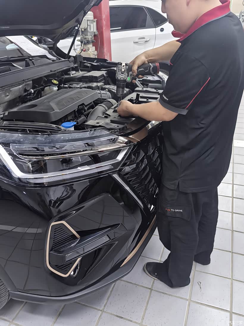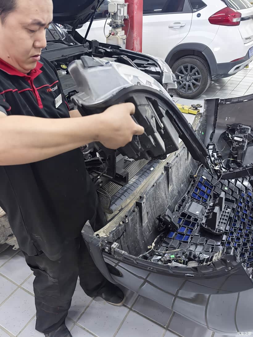 大灯安装完毕,师傅随即拿起中网,对准卡扣稳稳归位,动作干脆利落。