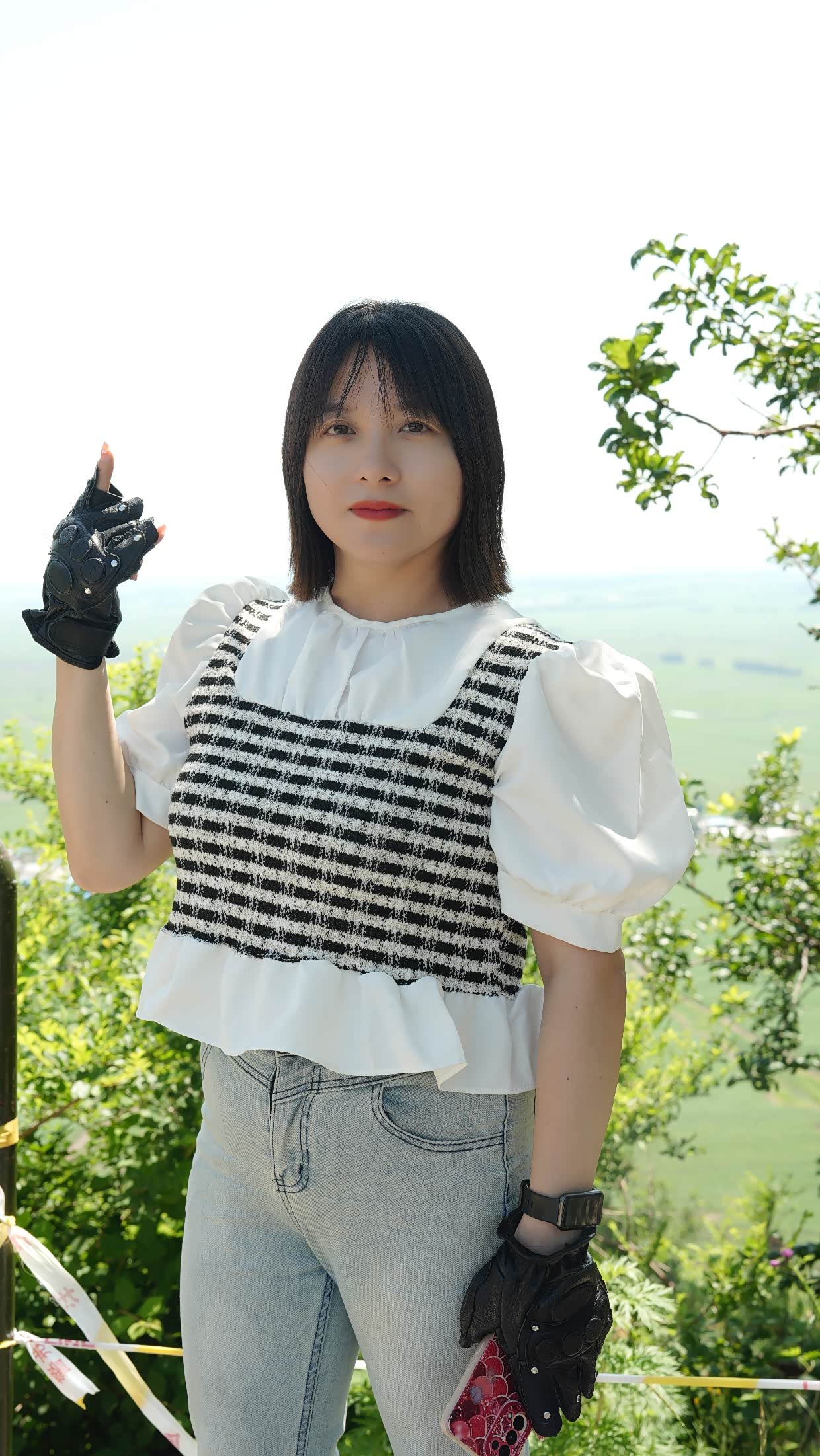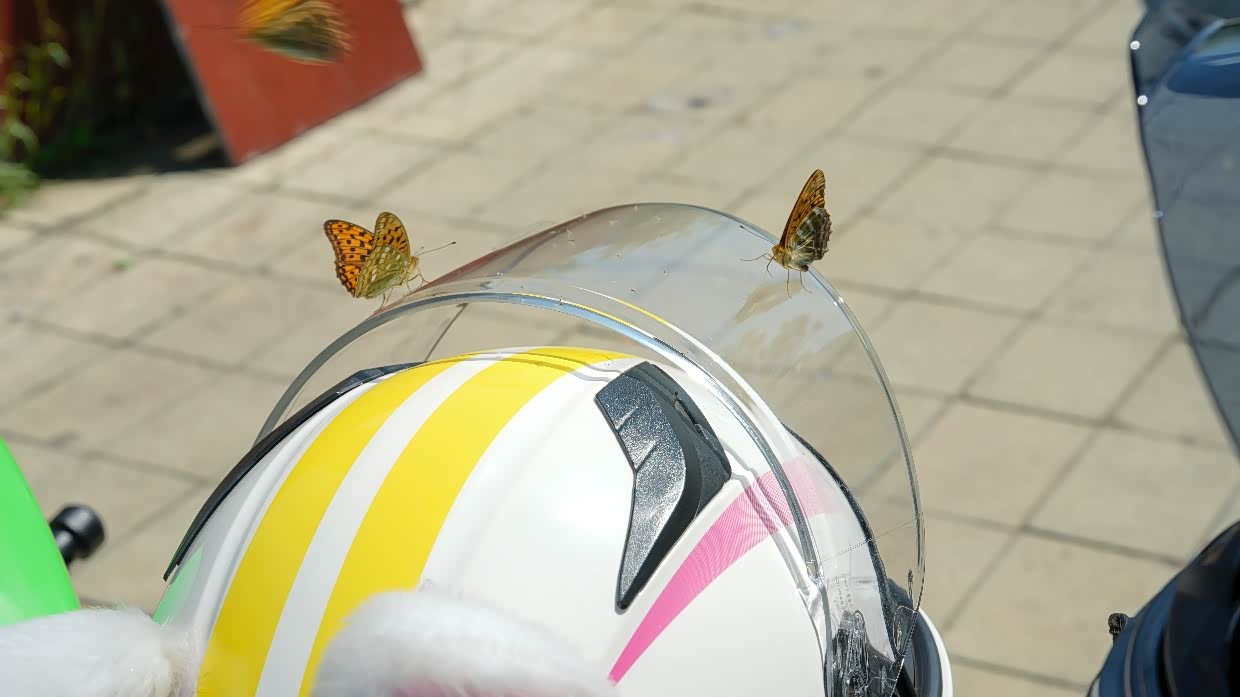 更让我们惊喜的是,在山顶休息的时候,一只小蝴蝶竟然落在了我的头盔上。它停了好一会儿,翅膀轻轻扇动着,仿佛在和我们打招呼。老婆赶紧拿出手机,把这温馨的一幕拍了下来,这大概就是大自然给我们的小惊喜吧!