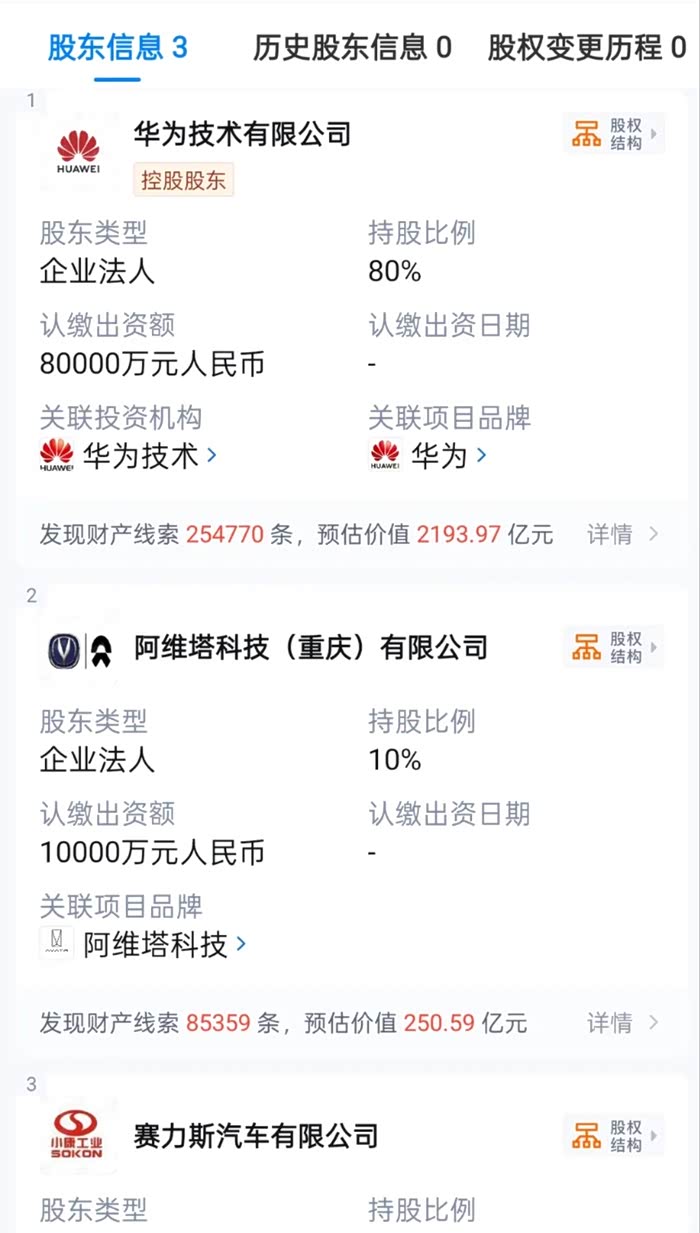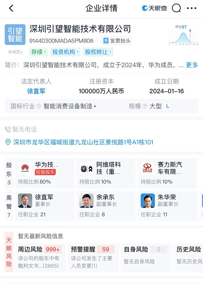 华为旗下企业深圳引望智能技术有限公司(以下简称华为引望)完成工商信息变更,华为持股从原来的100%调整为80%,新增阿维塔科技(重庆)有限公司(以下简称阿维塔科技)、赛力斯汽车有限公司(以下简称赛力斯汽车)两大股东,分别持股10%。