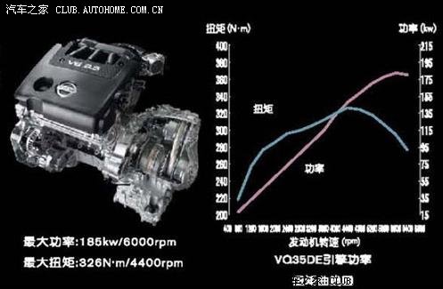 日产VQ35DE发动机采用全铝材质,DOHC,24气门结构,被广泛用于日产中高级轿车,跑车系列和英菲尼迪车型上,并且VQ35DE机型连续五年获得Ward’s全球十佳发动机奖 日产VQ系列发动机是耗资570亿日元在日本研发并于1994年投产的V6形式发动机。VQ系列发动机排量从2.0升至4.0升,14年间共推出14款不同型号的发动机。VQ系列发动机的共同特点是采用全铝材质,DOHC,24气门结构和日产EGI顺序多点电喷系统,后期版本配备了NICS可变进气控制系统和CVTC连续可变气门正时控制系统,并且还推出了采用NEO-Di缸内直喷技术的VQ25DD发动机。VQ系列发动机从一推出便被广泛用于日产中高级轿车,跑车系列和英菲尼迪车型上。 日产VQ25DE和VQ35DE发动机属于第四代VQ系列发动机,其采用了日产NICS可变进气控制系统和CVTC连续可变气门正时控制系统,其中2.5升V6发动机在6000转时可以输出136kW的最大功率,4400转时可以输出232Nm的最大扭矩。3.5升V6发动机6000转时可以输出185kW的最大功率,4400转时可以输出326Nm的最大扭矩。