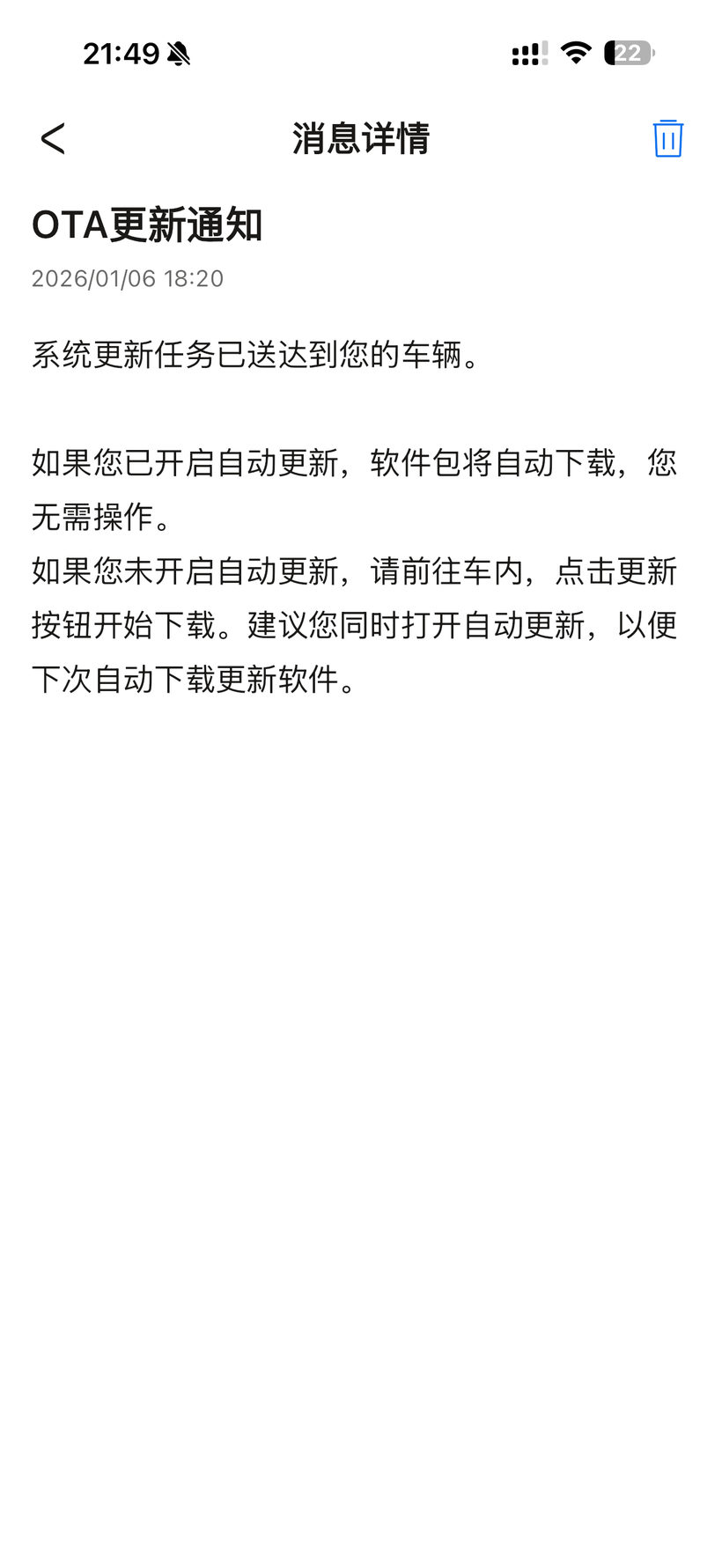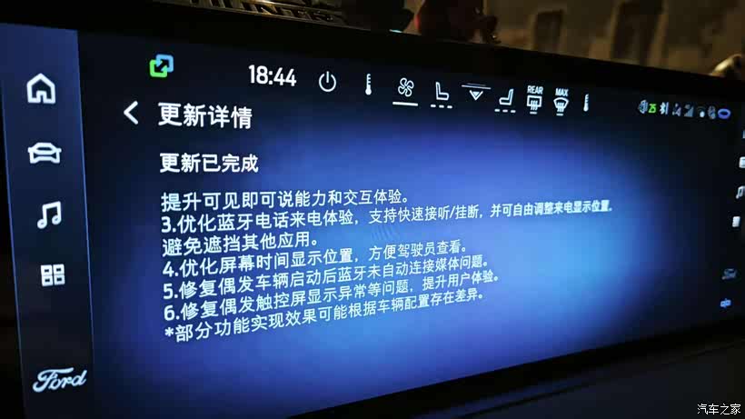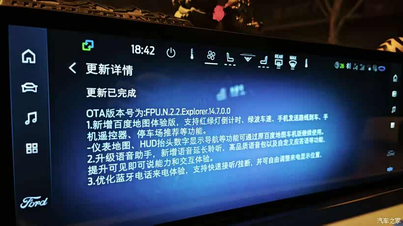最近一段时间,经常看到抖音,快手,微博,小红薯上面的一些汽车博主和福特车主一直再发布关于探险者车机升级的消息,作为一名资深的大探车主,我当然是非常期待的,后来又了解到升级是分批ota推送的,看到车友群里有车友收到推送通知是又开心,又嫉妒,不知道什么时候才能轮到我!好在没又等到花儿都谢了,差不多一周左右的时间,早上拿出手机准备远程控车,开空调,开座椅加热,无意间就看到系统有相关的信息推送,然后就收到了系统升级的通知,太好了,终于到我了。