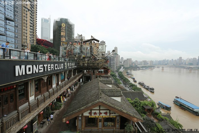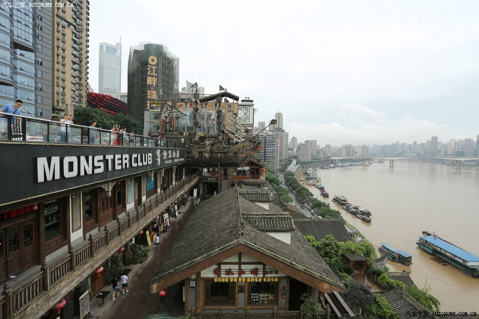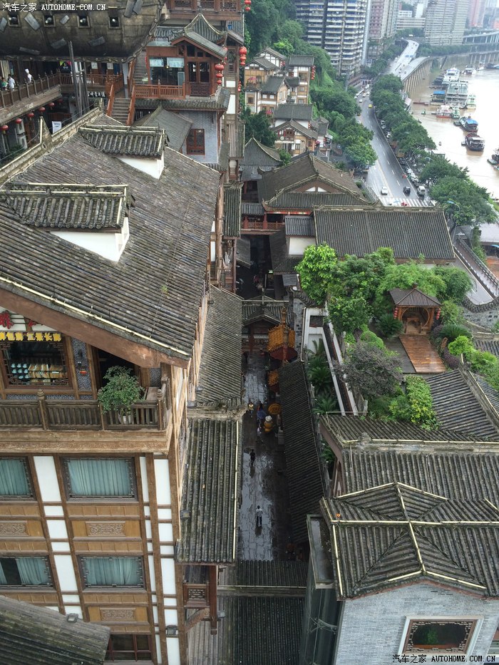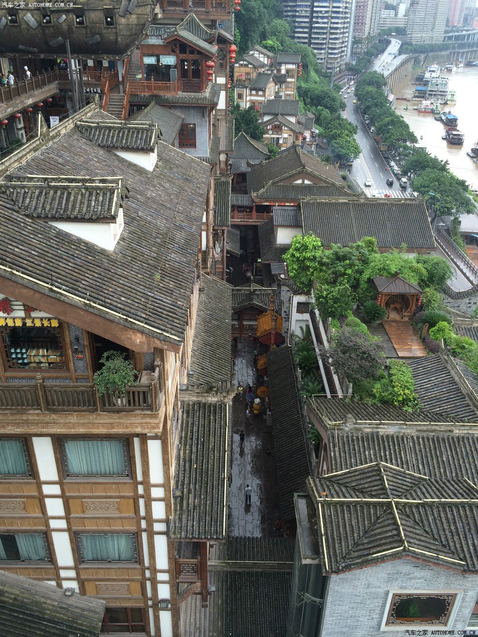 辗转着公交去往洪崖洞,站点旁边就是洪崖洞,一艘巨大的海盗船模型树立在广场上,凭栏远眺,滔滔江水,轮船穿梭其中,向下俯看,是一层层古式的吊脚楼,本感觉自己是在平地的马路上,谁知其实自己已经是站在11楼最高层了,“楼下”可见游人悠闲的逛着每一层的各色店铺。往下逐层游览,既可走楼梯,也可坐直达电梯,不过后者需付钱。整栋楼给每层做了大致的功能区分,有的是餐饮酒楼,有的是特产美食,有的是特色工艺品,内里特色不大,个人感觉,洪崖洞的魅力,一是靠江而建,看江看水有着极好的视野,二是它神奇的交通和建筑结构,“11层”与马路连成一体,如履平地一般,完全不象是高楼之上,向下俯视方知楼下还有许多层,感觉太奇妙了!