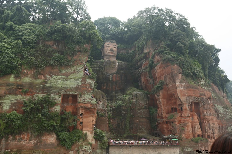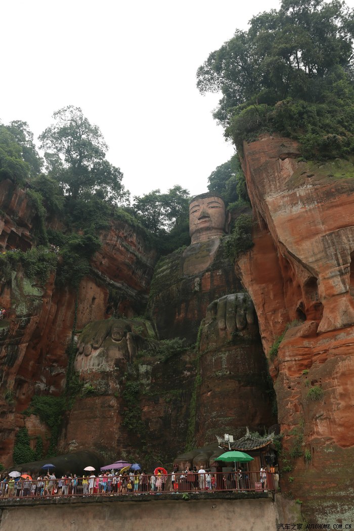 乐山大佛,到达时天空还在飘雨,但丝毫没有浇灭游客的热情,咨询了下工作人员,景区内瞻仰大佛尊容还需排队,考虑到步行游览的艰辛,且无法看到大佛全景,遂决定放弃,直接到码头坐游船观赏大佛,游船缓慢前行,著名的乐山大佛真身呈现在眼前,真正“佛是一座山,山是一座佛”,巨大的佛像镶嵌在雄伟的山体之中,佛像眉目清晰,双手置于膝上,体态端庄威严,此时,人与它相比顿时渺小无比,人身还没有佛祖的大脚趾高。