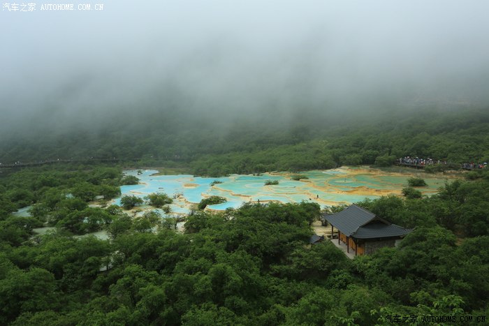 六点半从九寨沟出发赶往黄龙景区,原定约两小时赶到,谁知行进至一半山上云层越来越厚,雾气渐大,人若在云中游走一般,遂缓慢前行,约10点到达黄龙,山下没有雾气,抬头望山依然雾气缭绕,有点担心看不到五彩池的美景,但既来之则安之,买票上山!乘坐缆车上山,雾气萦绕林间,如行走在仙境一般,由于海拔较高,为避免高反,缓慢步行往最著名的五彩池,约一个小时后到达五彩池,遗憾的是,此时的五彩池被雾气笼罩,只可隐约见到蓝绿色的湖水,如仙境瑶池般,耐心等待雾气消散,五彩池终于现出了它的真面目,浅绿,深绿,蓝绿,黄,蓝,五彩斑斓,近看湖水清澈纯净,越发将色彩衬得清晰明艳,湖面由黄色的钙华物将其分割成若干个小池,层层叠叠,远看似彩色的梯田一般层层分布。从五彩池往出口方向步行而下,沿途亦经过了若干小景点,潺潺水声不断,冲刷着黄色而光滑的钙华物,亦可更近距离地欣赏一个个小彩池,感受黄龙奇特的地质地貌。此地的湖水之美与九寨沟又有所不同,虽水质是一样的清澈明净,湖水以蓝绿为主,但黄龙的“黄”尤其特别,黄色的钙华物质体现在每一处的池水中。同时它又是层叠分布,将一池湖水分割成不规则而又边缘圆滑的小区域,高低错落,显得极有层次感。